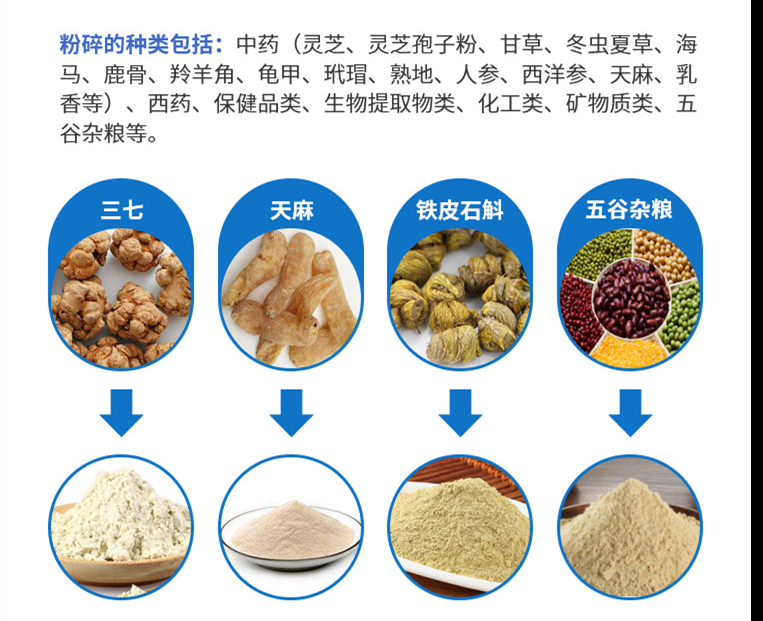 同时该设备的特点包含1. GMP设计 按GMP设计要求,采用符合国家药品、食品标准要求的不锈钢制作,与物料接触部位为抛光不锈钢,内部边角圆弧过度,全密闭作业无粉尘污染、无物料损耗。2. 运行方便 结构紧凑合理占地面积小,只需配备空压机、接上水、电、气即可投入运行。3. 操作简便 易于组装拆卸与换料,便于日常维护。可用水、酒精等清洗消毒。4. 低温保质粉碎 低温保质粉碎,新鲜中草药及动物鲜活组织粉碎。5. 温度可控 粉碎温度可通过调节冷却水的温度和流量来控制。需低温粉碎时,根据用户要求可配置制冷系统
