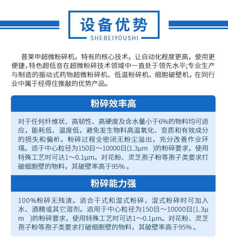 普莱申蜂花粉超微粉碎机系列采用双桶投料,全自动翻转进料,更省心省力,负压密封设计,噪音低,干净安全。同时采用低温粉碎技术,保存了物料活性成分,机器采用一体化设计,节省空间,更节能,研磨粉碎方式,可连续工作16小时。目前采用的是先进的数控屏幕,操作清晰便捷,操作过程效率高,耗能低,不易损坏。