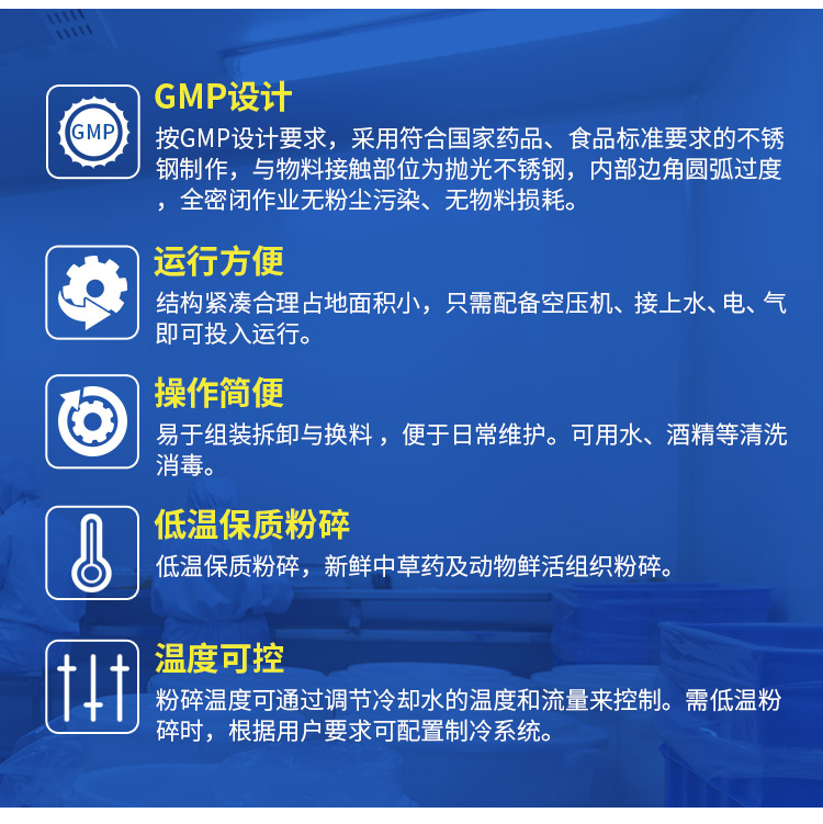◆粉碎腔带有冷却水夹套,可调节水的温度、流量来控制粉碎腔的温度。也可配置强制冷系统,使物料在-30℃-0℃的环境下作。