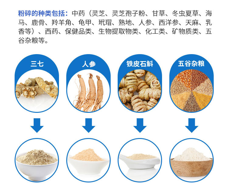 该机用于超细粉碎,可适用于任何纤维状、块状、韧性、特硬、黏性物料的粉碎,为了提高超细粉的产量和效果,物料入机前需加工为5mm。中药超微粉碎机是一种可以将中药、食品原料、化工原料等物料给粉碎,而加了超微这几个字又体现了粉碎机的主要性能,是把物料粉到细致。